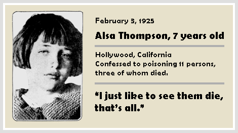 Thirty years later on, precocious Alsa Thompson, the “Baby Borgia,” in 1925, at the age of seven [yes, that’s 7!], confessed to poisoning eleven persons, stating with her twin baby sisters who died, and a caretaker lady she didn’t like. [37]