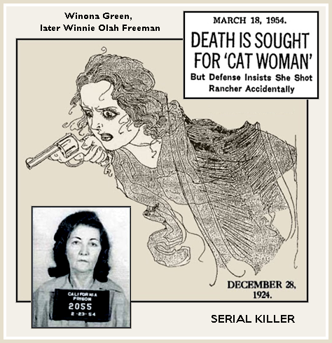 [9] Winona Green (Winnie Ola Freeman) – “Outlaw Blood Made This Choir-Girl A Demon! – Alienists See in Her Self- Confessed Slaying of Two Relatives a ‘Throwback’ to Weird ‘ Indian Tribal Vengeance,” syndicated, Springfield Republican (Mo.), Dec. 28, 1924, (p. ?). See: Winnie Ola Freeman (Winona Green), “The Cat Woman”: Arkansas Serial Killer – 1954