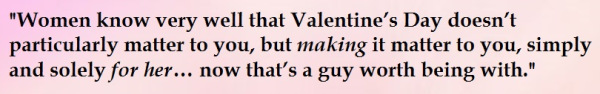 Valentine’s Day gives your crush or girlfriend or fiancé or wife, either a taste or a reminder (women love being reminded) of your ability to care about things not because you care about them, but because you care about her… and she cares about things. Get it?