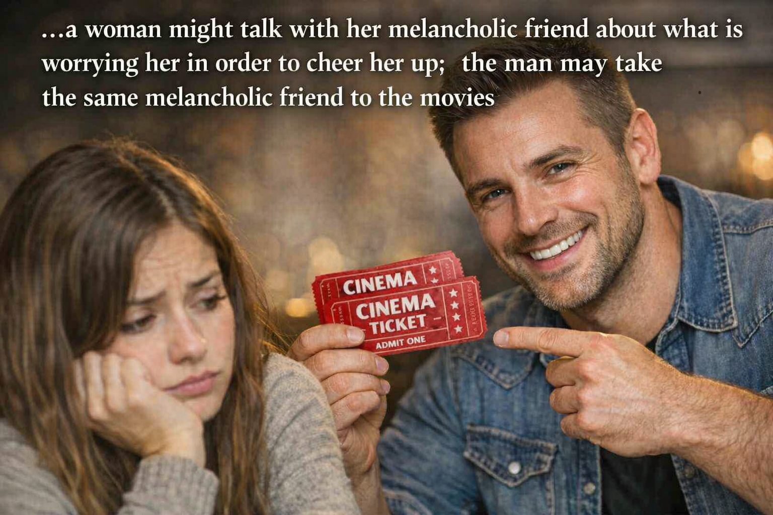 According to this theory, men’s lives are guided by action empathy, which are said to be an inadequate substitute for genuine emotional empathy, a skill typically displayed by most women. Action empathy is defined as the ability to see physical motivations from another person’s point of view, and to focus on which concrete actions those people might perform, but that men otherwise do not understand emotional empathy in the way women do – women who are able to take another person’s perspective and know how they feel. Levant states, “Action empathy also differs from emotional empathy in terms of its aim. Emotional empathy is usually employed to help another person and is thus prosocial, whereas action empathy is usually employed in the service of the self.” ¹