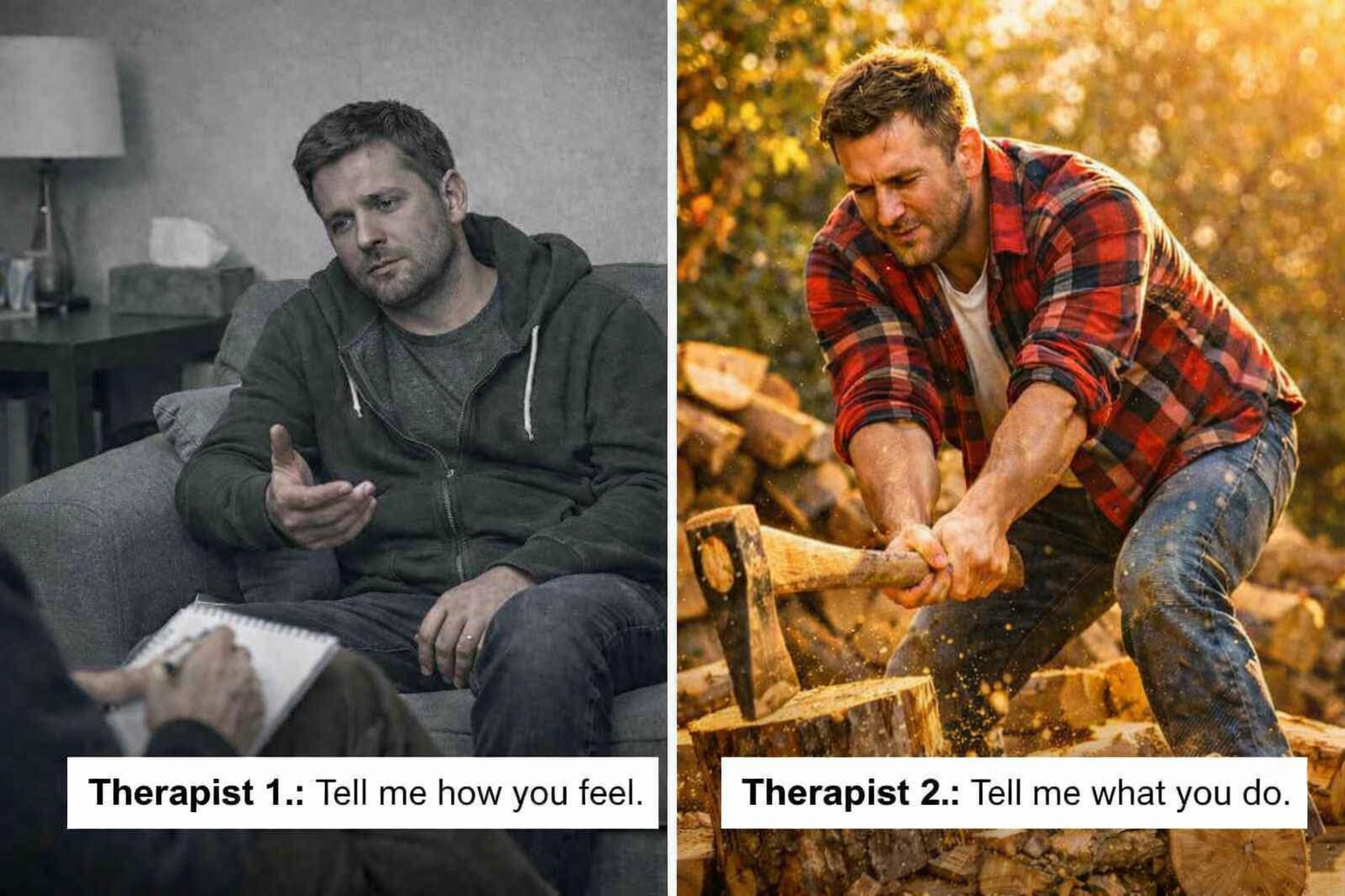 This is probably a reason why men talk so much about work, sports, building things, computer games, recreational activities – it may be their preferred way of communicating the ways they wrestle with psychological issues. Sadly, the therapeutic industry is quick to chastise men’s preference for intelligent actions, conflating them with pathological reflexes such as unconscious acts of aggression, dependence on drugs and booze, and other destructive versions of “acting-out” as they are so often branded.