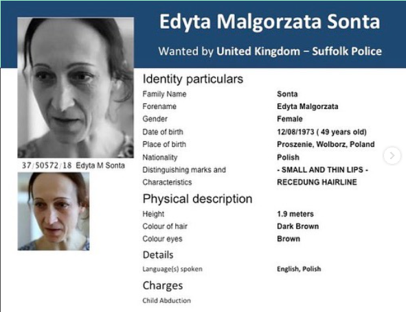 Edyta Malgorzata Sonta is the mother of Rhian Toolan and the ex-wife of Tom Toolan. Sonta previously lived in the United Kingdom where Tom Toolan continues to live. On 9 August 2018 Sonta fled the UK to her native Poland, taking four year old Rhian with her. It is believed that Sonta and Rhian continue to live in Poland. Mr Toolan last spoke to his daughter online about a year after the abduction.[1][2][3][4][5][6]