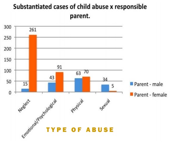 In Australia a perpetrator sample of 582 cases of substantiated child abuse by parents shows that mothers committed 73 per cent of parental child abuse, while fathers were responsible for 27 per cent. In this sample mothers were responsible for 161 cases of neglect, 72 emotional and psychological, 76 physical and 3 sexual abuse cases against their children. In the same financial year, fathers were responsible for 37 cases of neglect, 41 emotional and psychological, 65 physical and 22 sexual abuse cases against their children.[9] Professor Michael Woods from the University of Western Sydney stated that the data was not surprising as it was in line with the international findings regarding perpetrators of child abuse, and added that the data debunked a common misconception about fathers being the most major risk for their children's wellbeing. He stated that the common myth about violent fathers resulted from previous data-aggregation practices (in child protection departments) of lumping de factos, live-in boyfriends and overnight male guests together in one category with fathers as "male carers" which had distorted beliefs about who abused children.[10][11]